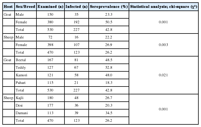 T. gondii was higher in goats (42.8%) than sheep (26.2%). While, based on different breed of goats, it was Teddy (52.8%), Beetal (48.5%), Kamori (47.5%), and Phari (18.5%). Whereas, the seroprevalence based on different breeds of sheep was Dmani (34.5%), Kajili (26.3%), and Desi (20.3%) (