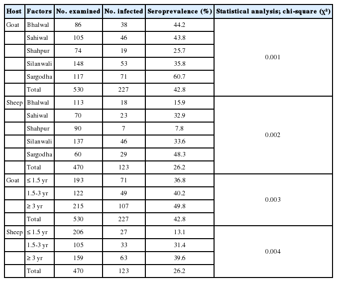 P<0.05) in the prevalence and geographical distribution of toxoplasmosis in goats and sheep of rural areas in different districts (