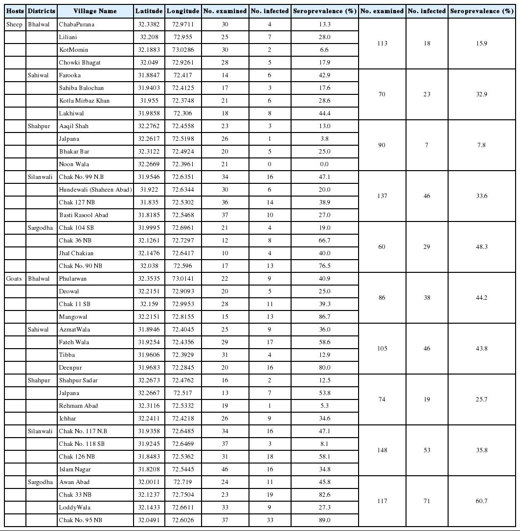 Fig. 2). The rate of infection in sheep of district Sargodha (48.3%) was higher followed by Silawali (33.6%), Sahiwal (32.9%), Bhalwal (15.9%), and Shahpur (7.8%), while goats of district Sargodha (60.7%) had a higher seroprevalence followed by Sahiwal (43.8%), Bhalwal (44.2%), Silawali (35.8%), and Shahpur (25.7%). The village-wise prevalence was given in