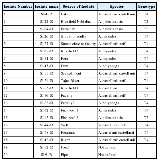 - 25. Rezaeian M, Niyyati M, Farnia S, Motevalli Haghi A. Isolation of Acanthamoeba spp. from different environmental sources. Iran J Parasitol 2008;3:44-47.