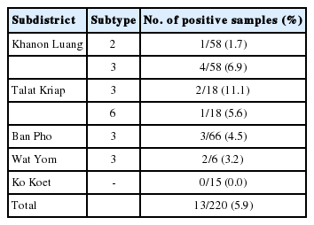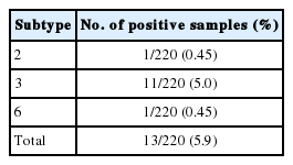 Table 2. Only ST3, ST2, and ST6 were detected. ST3 (5.0%; 11/220) was the predominant subtype, followed by ST2 (0.45%; 1/220) and ST6 (0.45%; 1/220) as shown in