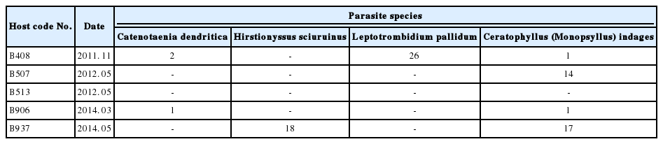 Key words: Sciurus vulgaris, Catenotaenia dendritica, Hirstionyssus sciurinus, Leptotrombidium pallidum, Cetatophyllus (Monopsyllus) indages, red squirrel, Cheongju, Korea