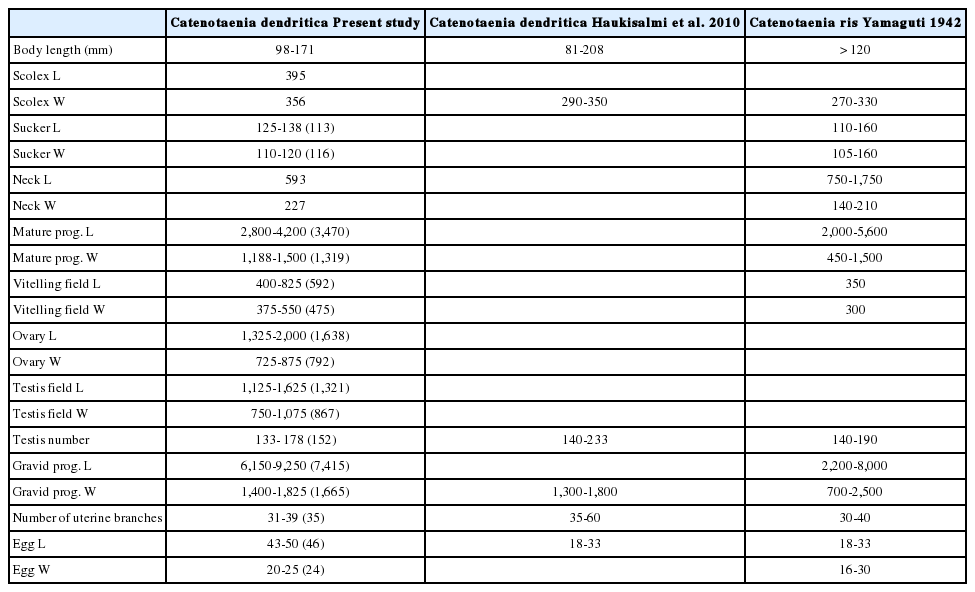 Table 2.Comparison of Catenotaenia spp. morphometrics with those of previous studies