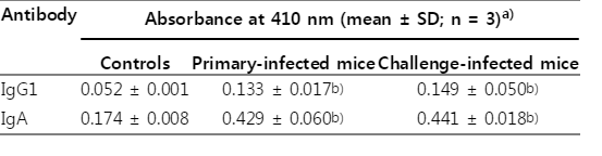 Controls Primary-infected mice Challenge-infected mice IgG1 0.052 ± 0.001 0.133 ± 0.017b) 0.149 ± 0.050b) IgA 0.174 ± 0.008 0.429 ± 0.060b) 0.441 ± 0.018b)