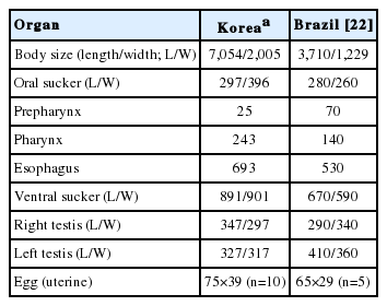 Table 2 Comparative measurements of Oswaldotrema nacinovici found in Korea with that reported in Brazil (μm)