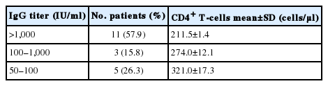 Fig. 1). The IgG titer was greater than 1,000 IU/ml in 57.9% cases. Different categories of IgG anti-