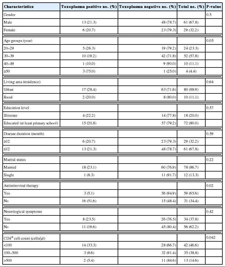 This study was carried out on 90 HIV-infected patients in a southern part of Iran (Jahrom and Yazd) between September 2013 and October 2014. Written informed consent forms, compiled by the Ethics Committee of Jahrom University of Medical Sciences, Iran were signed by the patients. The participants were recruited to the Infectious Disease Department, which represents the most important center for diagnosis and monitoring of HIV-infected patients in this region. The diagnosis of HIV status was based on at least 1 previous and documented HIV positive ELISA confirmed by a western-blot test. Demographic information, such as the age, gender, socio-economic (living area, monthly income, and education level) and clinical data (contamination mode, disease duration, and antiretroviral therapy), were collected from patients during their visits to the Department. Two blood samples were collected from each patient; the first one in a plastic serum tube and the second one in an EDTA tube. The EDTA whole blood was tested on the same day for CD4+ T cell counts in the laboratory of University Hospital of Jahrom, southern Iran. The serum samples were labeled and stored at −20°C, then transported to the reference laboratory in Jahrom.