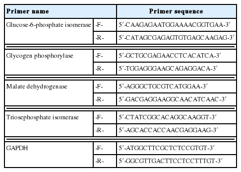 Total RNAs were extracted with protein and RNA extraction KitTM (Takara) from the virus-infected (V+) and uninfected (V) isolates (Fig. 3). To elucidate the levels of mRNA expression in the V+ and V isolates, the relative quantities between 4 of glycolytic pathway proteins and GAPDH mRNA were assayed by relative real-time quantitative PCR and expressed as the ratio between the 4 above-mentioned proteins and GAPDH mRNA (Fig. 4).
