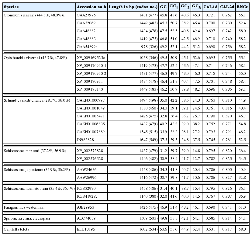 The RSCU values of platyhelminth tyrosinase genes were computed using the CodonW program, and the values were used in a correspondence analysis to investigate synonymous codon usage variation. The corresponding analysis of these genes generated a series of orthogonal axes to reflect the trends responsible for variation in codon usage, of which the first 2 principle axes accounted for 55.0% and 10.0% of the overall variation observed in RSCU of platyhelminth tyrosinase genes. As shown in Fig. 3A, the tyrosinase orthologs were widely scattered along with the primary axis related to their donor organisms, while genes with paralogous relationship were properly resolved along the second axis. The correspondence analysis of synonymous codons also separated G-/C-ending codons from A-/T-ending codons largely along the first axis (Fig. 3B). Correlation analyses between the position of genes along the axes and the nucleotide composition of respective genes demonstrated that the first axis has strong negative correlation with the nucleotide chemistry (correlation coefficient=−0.972), especially with the GC contents at the first (correlation coefficient=−0.887) and third (correlation coefficient=−0.995) codon positions (Table 3). ENC values depending on nucleotide composition as described above were similarly correlated to the primary axis (correlation coefficient=−0.961). Of these compositional criteria of nucleobases, GC2 exhibited the strongest correlation with gene positions along the second axis (correlation coefficient=−0.409).