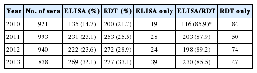 In contrast, it only increased from 21.7% (200/921) in to 25.5% (253/993) in 2011 by RDT. Although a surge was not observed as in the ELISA test, the RDT positive seroprevalence also showed an increasing trend in subsequent years, to 28.9% (272/940) and 33.1% (277/838) in 2012 and 2013, respectively (