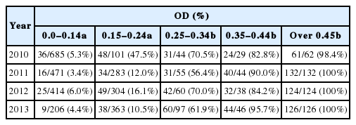In 2010, ELISA detected 135 positives among 921 (14.7%) and RDT detected more sensitively 202 positives (21.9%). However, RDT detected 87.4% (118 sera) of ELISA positives except for those sera of controversial OD just above the cut-off value; instead, it detected more positives in ELISA-negatives of 10.7% (84 sera). This pattern was maintained in 2011, 2012, and 2013 with the increasing seroprevalence of 23.1%, 23.6%, and 32.1% by ELISA and 25.5%, 28.9%, and 33.1% by RDT, respectively (