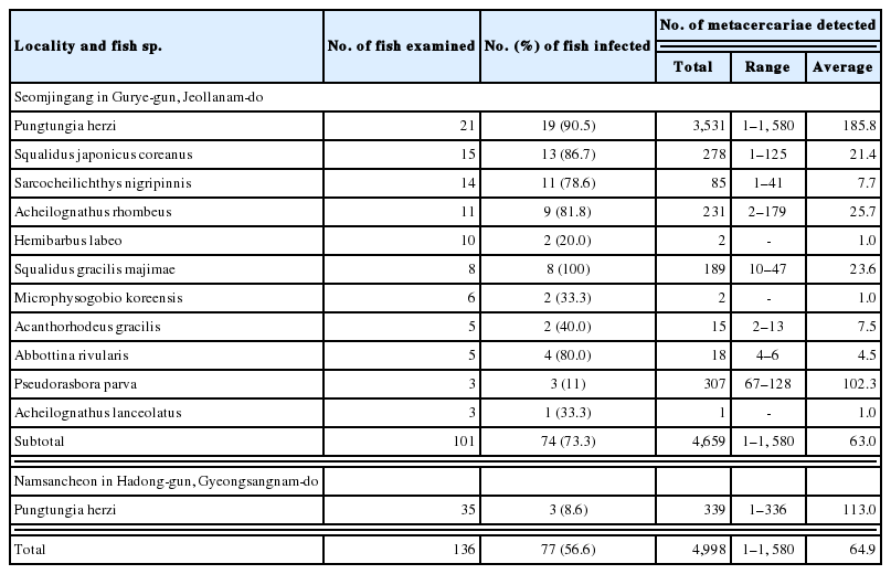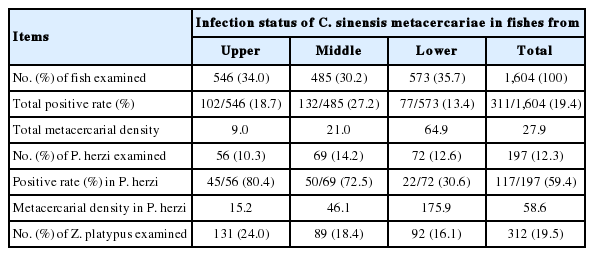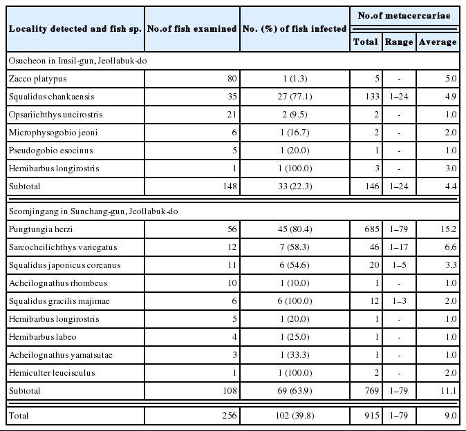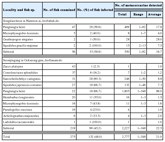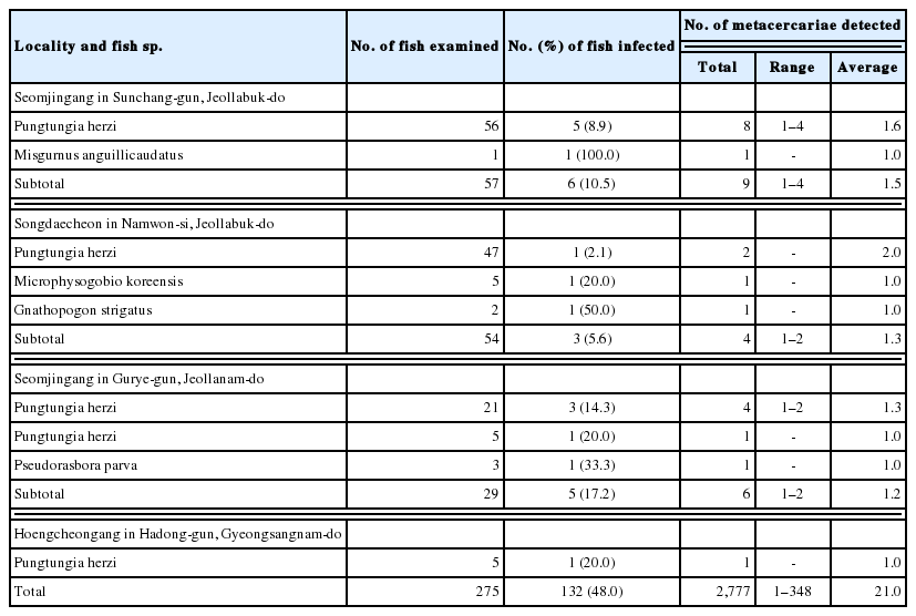 Warning: fwrite() expects parameter 1 to be resource, boolean given in /home/virtual/lib/view_data.php on line 84 Prevalence of Clonorchis sinensis Metacercariae in Fish from Water Systems of Seomjin-gang (River)