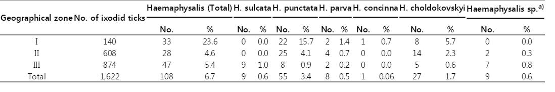 Table 1.The distribution of Haemaphysalis species in 3 different geographical zones