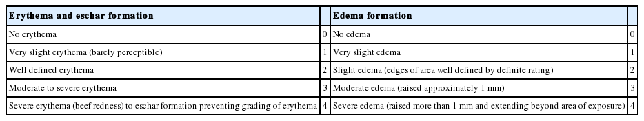 19]. It was then classified according to Draize method of classification using PII scoring as non-irritant (if PII<0.5), slightly irritant (if PII<2), moderately irritant (if PII<2–5), and severely irritant (if PII>5) [