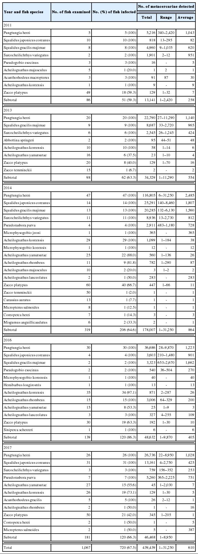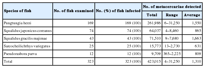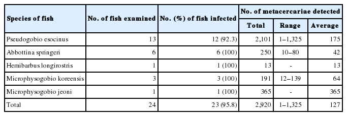 Table 7Infection status of Clonorchis sinensis metacercariae in rasborinid fish from Wicheon in Gunwi-gun, Gyeongsangbuk-do