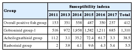 The susceptibility indices of CsMc were 412 in the overall positive fish group; 1,310 in the gobioninid group-1, 122 in the gobioninid group-2, 38.5 in the acheilognathinid, and 5.5 in the rasborinid fish group (