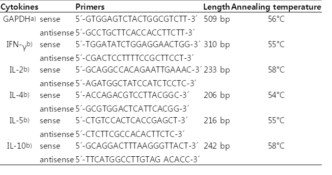 The extracted total RNA was reverse transcribed with Oligo d(T)15 primer using AMV-reverse transcriptase (Promega, Madison, Wisconsin, USA) at 37℃ for 1 hr. The resulting cDNA was subjected to polymerase chain reaction (PCR) for 30 cycles with respective primers designed from the sequences of five cytokines and GAPDH (glycer-aldehydes-3-phosphate-dehydrogenase). The thermal cycle profile was as follows: 1 min at 95℃ (denaturation step), 1 min at respective optimal temperature (annealing step), and 1 min at 72℃ (extension step) on a PTC 100 thermal cycler (MJ Research, Water Town, Massachusetts, USA). Primer sequences for amplification and the respective sizes of the PCR products of cytokines and GAPDH cDNAs are shown in