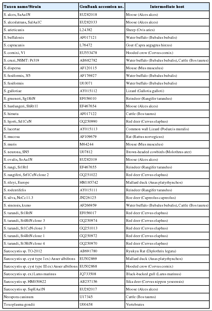 - 18. Hong EJ, Sim C, Chae JS, Kim HC, Park J, Choi KS, Yu DH, Park CH, Yoo JG, Park BK. Ultrastructural and molecular identification of Sarcocystis tenella (Protozoa, Apicomplexa) in naturally infected Korean native goats. Veterinarni Medicina 2016;61:374-381.