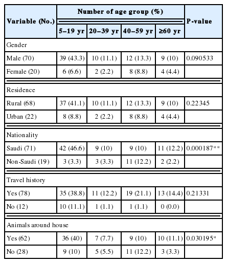 Infection appeared more frequently in Saudi people (71; 78.8%) than in non-Saudi (21.1%), with high significant differences observed among age groups and patient’s nationality (P <0.001). Moreover, 68.8% cases reported contact with domestic animals like dogs, sheep, goats, cattle, buffaloes, donkey or chickens in or nearby their houses, significant difference observed between different age groups (P <0.05).