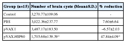 Total number of PRU cysts in whole brain was detected at 30 days post-challenge to evaluate the protective efficacy against the chronic infection of this parasite, the results of which demonstrated that the brain cysts in Kunming mice receiving pVAX-HSP60 immunization were significantly reduced in contrast to that of controls (