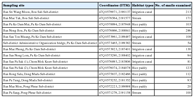The study was conducted from August 2016 to October 2017 in Mae Lao agricultural basin, which is located in the Mae Lao sub-river basin of Kok River basin in Mae Lao district, Chiang Rai province, Northern Thailand. Sampling sites were selected in consideration of the potential freshwater snail habitats and site accessibility in this agricultural area (