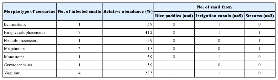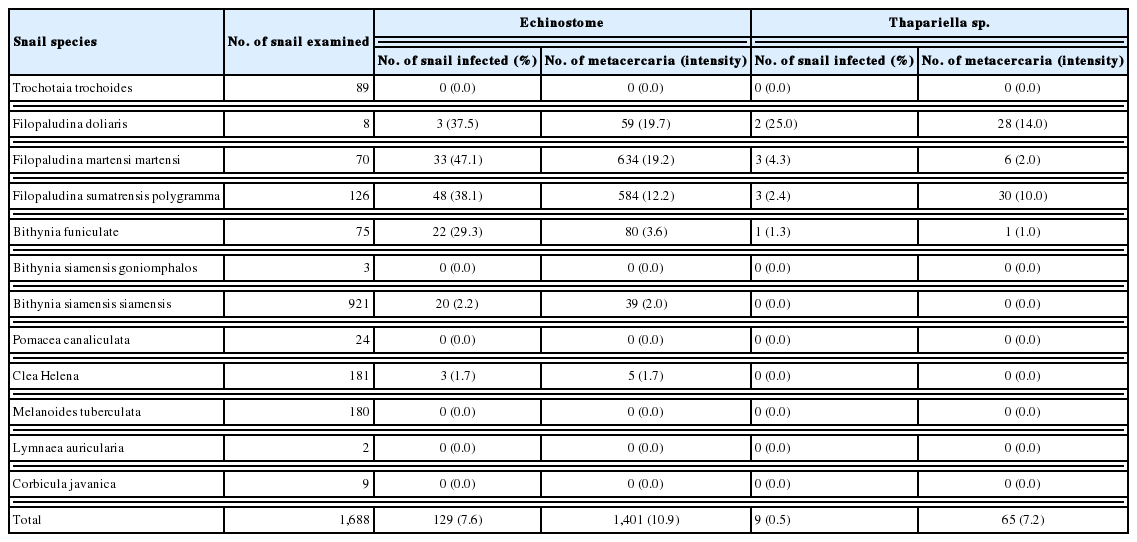 Table 6). Total 129 of snails were infected with echinostome metacercariae. Throughout the course of our survey, a total of 1,401 echinostome metacercariae were recovered from 6 snail species, including