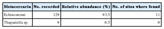 Thapariella sp. and echinostome metacercariae. The overall infection rate and the number of metacercariae recovered from snail species are shown in