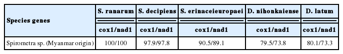 Table 1 Percentage pairwise sequence homologies of mitochondrial cox1 and nad1 genes of Spirometra species in Myanmar and various Spirometra species, Diphyllobothrium latum and D. nihonkaiense