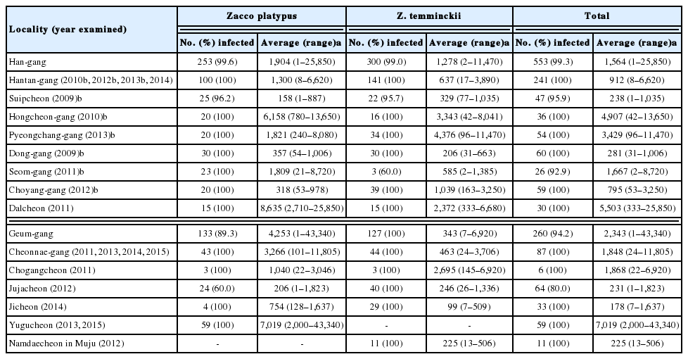 In the present study, we investigated the infection status with CaMc nationwidely in the freshwater fishes from the water systems of major rivers in Korea. Total 89 times in 50 sites (Han-gang: 11 times in 8 sites; Geum-gang: 10 times in 6 sites; Mangyeong-gang and Dongjin-gang: 5 times in 2 sites; Yeongsan-gang and Tamjin-gang: 10 times in 5 sites; Seomjin-gang: 13 times in 8 sites; Nakdong-gang: 29 times in 13 sites; streams in the east coast: 11 times in 8 sites) were surveyed. However, the data from the 12 times surveys performed in 10 sites (Hangang: 9 times in 7 sites; streams in the east coast: 3 times in 3 sites) were already reported in Cho et al. [12]. At any rate, total 14,977 fish including 2,200 Z. platypus, 1,732 Z. temminckii and 297 O. uncirostris amurensis were examined in this study. The proportion of Zacco spp. is more or less different by the surveyed sites (19.8–33.0%: 26.3% in average) and fish species (Z. platypus: 9.2–22.1%; Z. temminckii: 9.1–14.4%). These differences are due to the fish ecology in surveyed rivers.