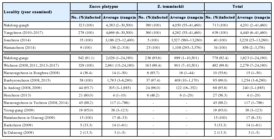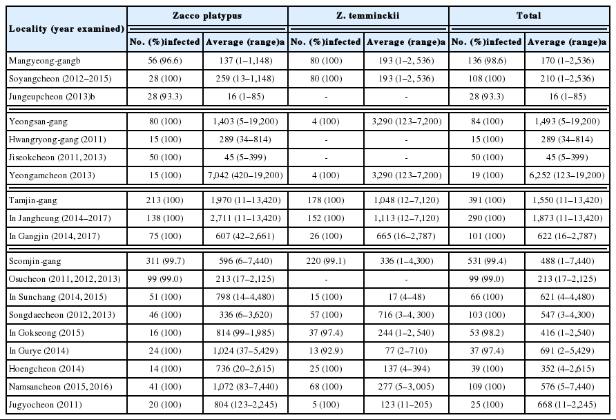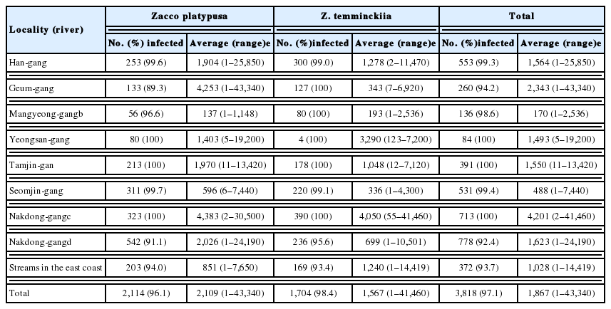 • The infection status of Centrocestus armatus metacercariae (CaMc) was broadly surveyed in freshwater fishes from major river systems in the Republic of Korea (Korea) during 2008–2017. A total of 14,977 fishes was caught and examined by the artificial digestion method. CaMc were detected in 3,818 (97.1%) (2,114 Z. platypus: 96.1% and 1,704 Z. temminckii: 98.4%) out of 3,932 Zacco spp. examined and their density was 1,867 (2,109 in Z. platypus and 1,567 in Z. temminckii) per fish infected. The prevalences with CaMc were high, 93.7–100%, in Zacco spp. from all surveyed areas. However, their densities were more or less different by the surveyed areas and fish species. They were most high in Nakdong-gang in Gyeongsangnam-do (4,201 in average), and followed by Geum-gang (2,343), Nakdong-gang in Gyeongsangbuk-do (1,623), Han-gang (1,564), Tamjin-gang and Yeongsan-gang (1,540), streams in the east coast (1,028), Seomjin-gang (488) and Mangyeong-gang (170). In another species of rasborinid fish, Opsariichthys uncirostris amurensis, CaMc were detected in 222 (74.8%) out of 297 ones examined and their density was 278 (1–4,480) per fish infected. CaMc were also detected in total 41 fish species except for the rasborinid fish, Z. platypus, Z. temminckii and O. uncirostris amurensis. Conclusively, it was confirmed that among the 3 species of rasborinid fish, Z. platypus and Z. temminckii are highly prevalent and O. uncirostris amurensis is moderately prevalent with CaMc. Additionally, we could know that variety of fish species act as the second intermediate hosts of C. armatus in Korea.