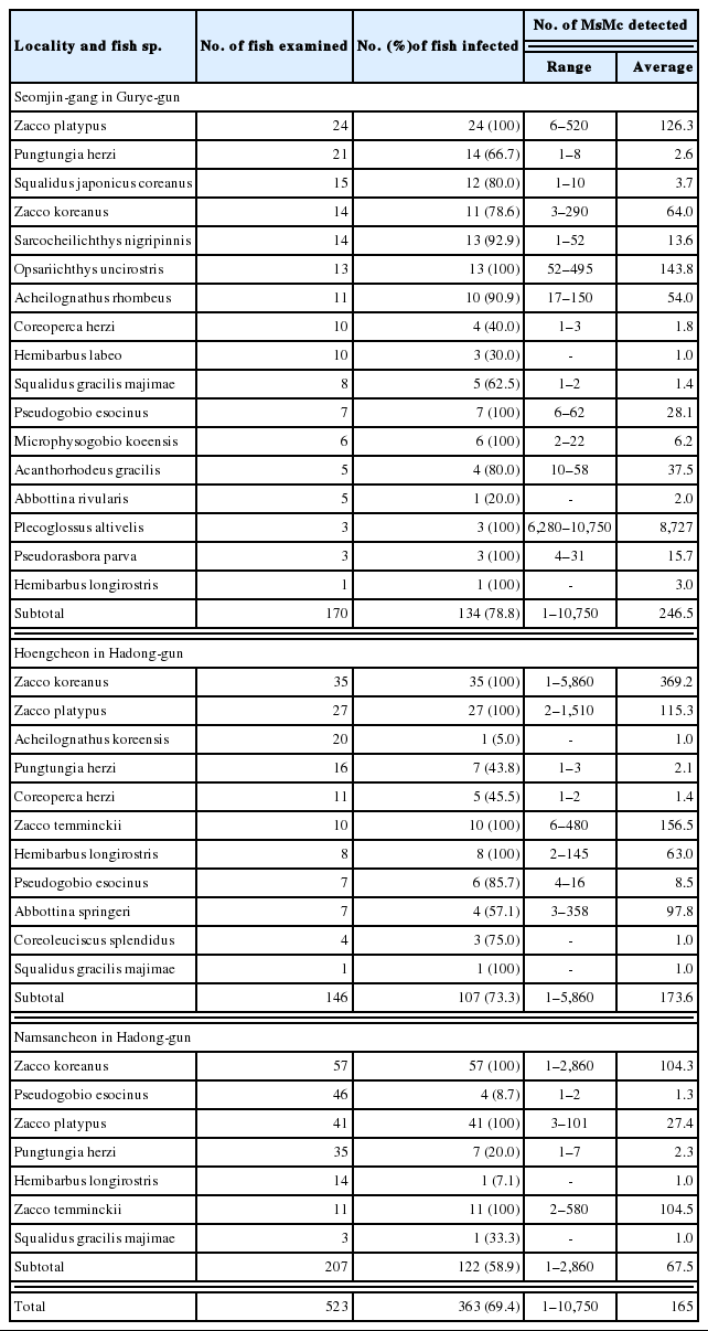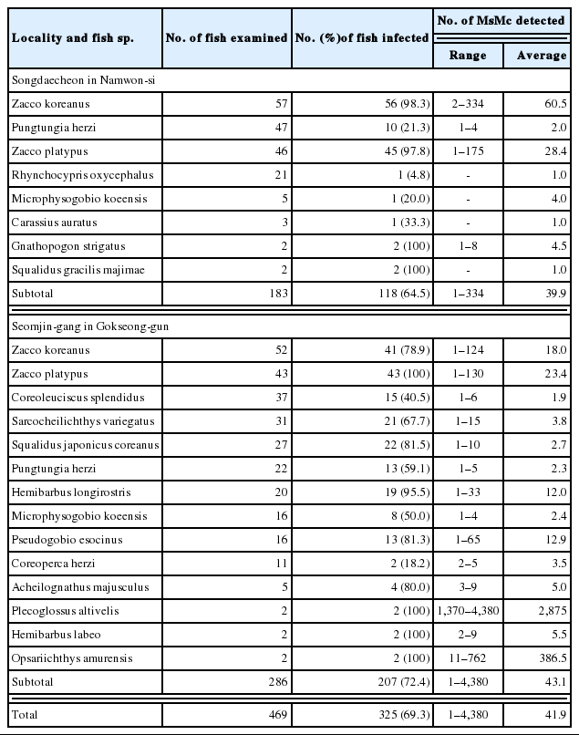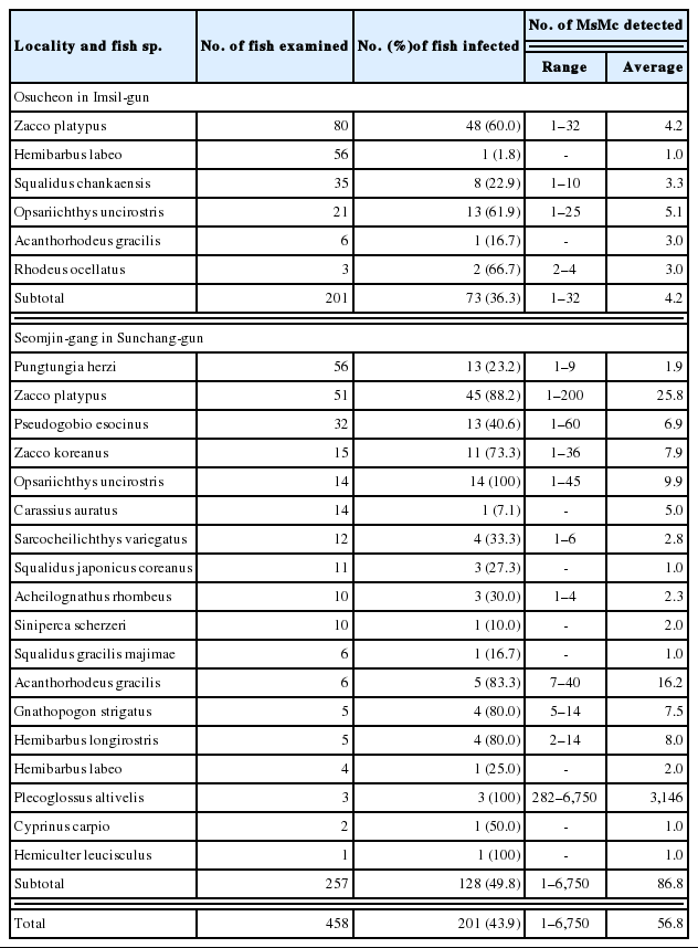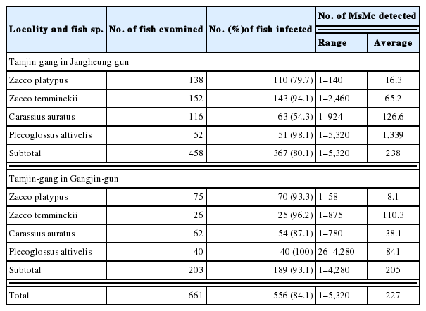 32]. Therefore, we performed the present study to know the infection status with MsMc in fishes from 2 rivers, Seomjingang and Tamjin-gang, located in the southern parts of Korea.