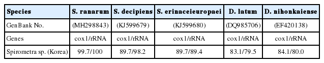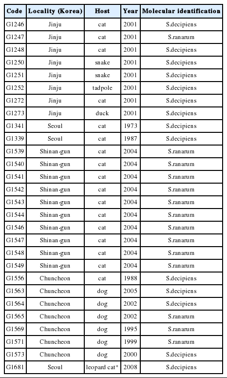 Warning: fwrite() expects parameter 1 to be resource, boolean given in /home/virtual/lib/view_data.php on line 84 Molecular Genetic Findings of Spirometra decipiens and S. ranarum in Korea