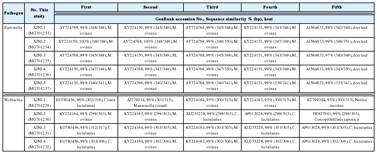 Bartonella and Wolbachia are distributed globally. They are rarely studied in China and widely distributed in Xinjiang. It is necessary to detect the pathogens of sheep keds such as Bartonella and Wolbachia. It will make an important contribution to the health of humans and animals.