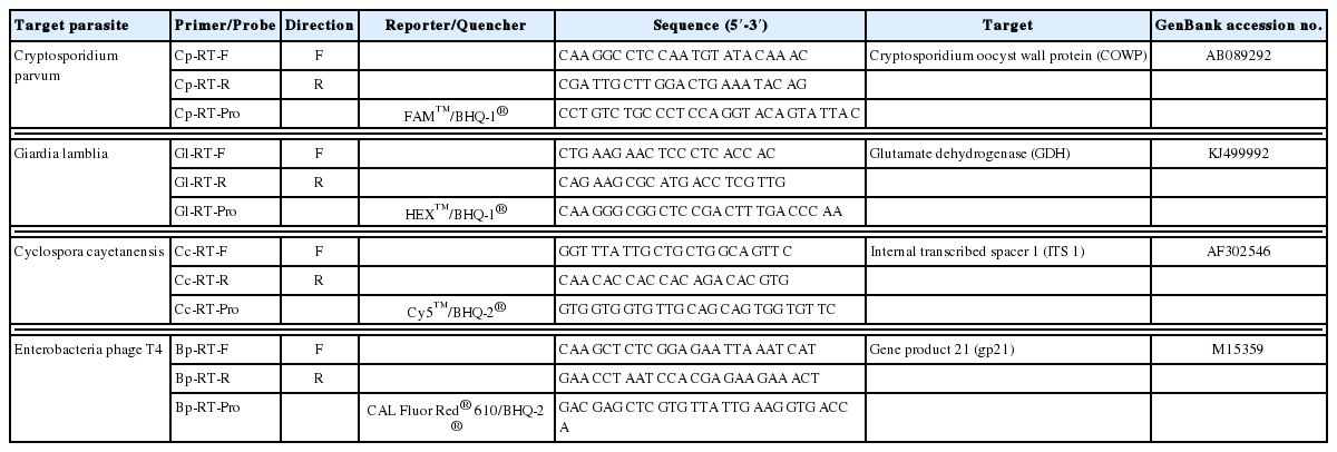 C. cayetanensis, and gene product 21 (gp21) of T4 phage. The gene sequences of all primers and probes were newly designed in the present study using the Geneious version R8 software (Biomatters Ltd., Auckland, New Zealand). For the differential detection of each parasite, when 3 species of parasites are co-infected, 4 fluorescent dyes (FAM