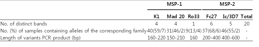 Samples were amplified for 30 cycles at 94℃ for 1 min, 61℃ for 2 min and 72℃ for 2 min. The PCR amplified gene fragments of MSP-1 and MSP-2 were electrophoresed on 3% agarose gels, stained with ethidium bromide, and visualized under ultraviolet light. Chi-square test was applied to analyze the results.