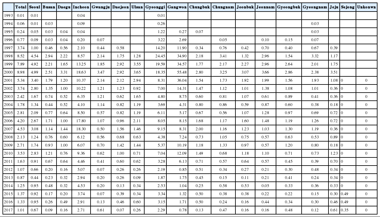 Table 2). Each malaria case in Korea is reported in the metropolitan area/province where the diagnosis is made, which may differ from the area where the infection occurred. In addition, it is particularly difficult to ascertain the transmission sites, since approximately 60% of vivax malaria in Korea is latent, with symptoms occurring 1–24 months after infection [