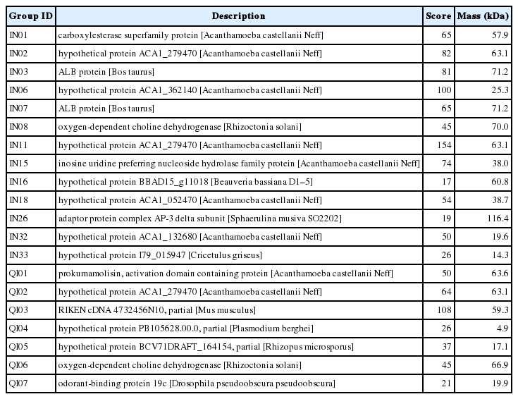 Among 41 up-regulated protein spots, 13 proteins with more than 5-fold higher expression and 7 qualitative increase proteins were selected for protein identification. To identify these highly expressed ES proteins in ACP strain, 20 protein spots were analyzed by LC–MS/MS. Results of the mass spectrometer and database search for 20 highly expressed protein spots are summarized in Table 1. Nine out of 20 protein spots were related to Acanthamoeba (Table 1). Hypothetical protein ACA_279470 (IN02, IN11, and QI02) contained a periplasmic- binding protein domain. One protein spot (IN15) showed similarity with inosine uridine preferring nucleoside hydrolase. Another spot (IN01) showed similarity with carboxylesterase of A. castellanii. Protein spots of IN08 and QI06 were similar to oxygen-dependent choline dehydrogenase of Rhizoctonia solani. Unfortunately, IN06, IN18, and IN32 were hypothetical proteins.