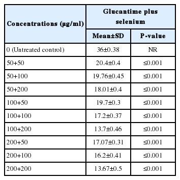 Table 4Comparison of the overall mean effect of various concentrations of selenium plus glucantime on the mean number of amastigotes in each macrophage