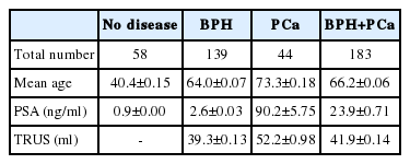 As study population, a total of 183 men were enrolled between October 2013 and November 2014. They consisted of 139 with BPH (mean age: 64.0±0.07) and 44 with prostate cancer (mean age: 73.3±0.18) who were undergoing treatment in the Department of Urology, Hanyang University Seoul & Guri Hospital. Inclusion criteria of BPH were (1) scores of 8 and more as International prostate symptom scores (IPSS) (2) <4 ng/ml of PSA (3) >20 ml of prostate volume (measured by transrectal ultrasonography; TRUS), and (4) >4 ng/ml of PSA and no evidence of malignant tumor on TRUS biopsy. Also, PCa patients proven by TRUS biopsy were only selected if they had undergone radiologic evaluation to determine their TNM clinical stage. Radiologic evaluation was carried out via prostate MRI and whole body bone scan (