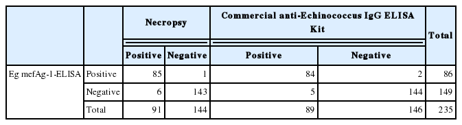 A total of 235 sheep sera were detected for Eg antibody by Eg mefAg-1-ELISA. Of 235 sera, 86 were CE positive for Eg mefAg-1-ELISA method (86/235, 36.60%), whereas 89 were CE positive for commercial anti-Echinococcus IgG ELISA Kit (89/235, 37.87%). Out of 91 positive sera confirmed by necropsy, however, 6 sera were judged as negative by developed Eg mefAg-1-ELISA method (