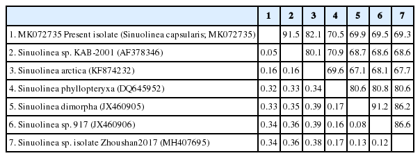 Genetic distance (P-distance; lower diagonal) and percent sequence similarity (%) (upper diagonal) obtained from the distance matrix based on a 1,554 bp 18S rDNA sequence of Sinuolinea capsularis with all Sinuolinea species available in GenBank