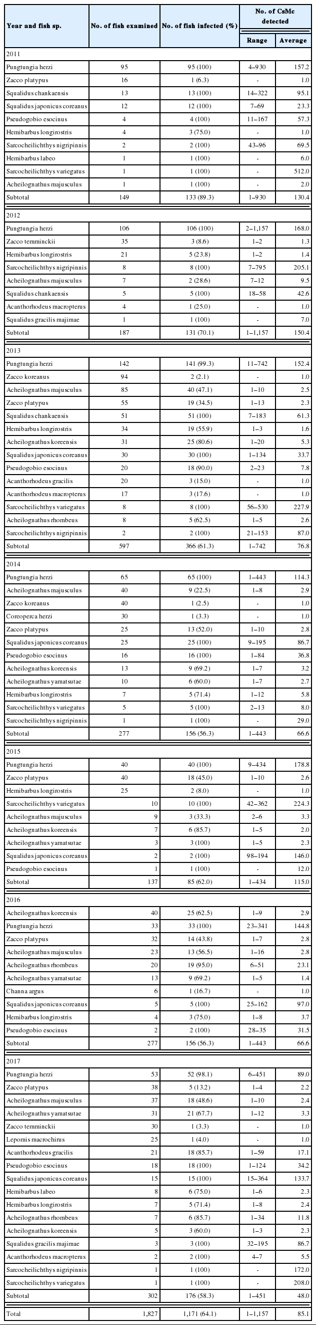CsMc were detected in 532 (99.6%) out of 534 P. herzi examined and their average density was 147 per fish infected. The densities were most high in 2015 (179), and followed by 2012 (168), 2011 (157), 2013 (152), 2016 (145), 2014 (114), and 2017 (89). The infection status with CsMc in P. herzi by the year examined was detailedly revealed in Table 2.