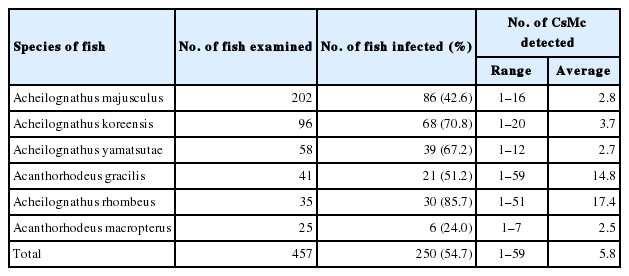 CsMc were detected in 250 (54.7%) out of 457 fishes examined and their average density was 5.8 per fish infected. The infection status with CsMc by the fish species, i.e., A. majusculus, A. koreensis, A. yamatsutae, A. gracilis, A. rhombeus, and A. macropterus, was detailedly revealed in Table 4.