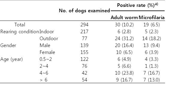 Table 2). No significant differences were detected between males and females. No infection was detected in dogs of younger than 2 years, whereas only adult worm infection (1.9%) was verified in the 2-4 year age group. The positive rates of adults and microfilariae were the same in the 4-6 year age group, 11.1%. These rates equally decreased to 6.5% in dogs of older than 6 years.
