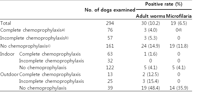 Table 3). The infection rates were much higher in the non-chemoprophylaxis group (14.9%) than in complete (4.0%) and incomplete chemoprophylaxis groups (5.3%). In the case of indoor dogs, no microfilariae were detected in complete and incomplete chemoprophylaxis groups, and only 1 dog (1.6%) was infected with adult worms in the complete chemoprophylaxis group, which contained 63 dogs. Neither adult worms nor microfilariae were detected in the incomplete chemoprophylaxis group. However, the prevalence of adult worms and microfilariae were 4.1% and 4.1%, respectively, in the non-chemoprophylaxis group. The prevalence in outdoor dogs was not significantly different from that of indoor dogs. We detected only adult worms in complete (12.5%) and incomplete chemoprophylaxis groups (15.4%); however, in non-chemoprophylaxis group, the adult worm positive rate was 48.4% and the microfilarial positive rate was 35.9%.