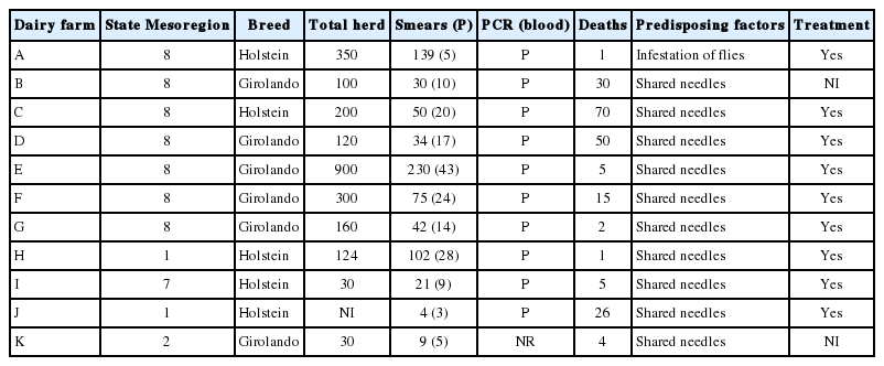 In all positive properties of this study, clinical signs associated with cattle death were observed. The most frequent clinical signs were apathy, anorexia, anemia, weight loss, abrupt drop in milk production, reproductive disorders and nervous signs (