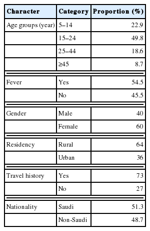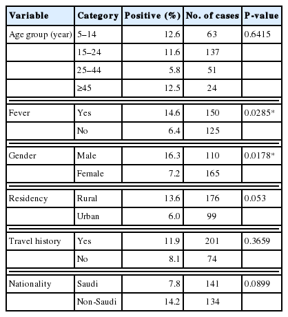 There were 321 patients agreed to participate in our study. Patients met the inclusion criteria (n=275) were enrolled in the study. The description of study’s population is stated in Table 1. Most of the patients were females (165; 60%) with mean age of 22.1±10.7 years. The patients’ age was ranged between 5 and 64 years, with a mean age of 23.5±13.19 years and a median age of 21 years. Over 73% of the participants were below 25 years. Fifty-one per cent of patients were Saudi citizens and about 49% were non-Saudi immigrants. The majority of patients (73%; 221/275) reported a history of recent travel to malaria-endemic areas.