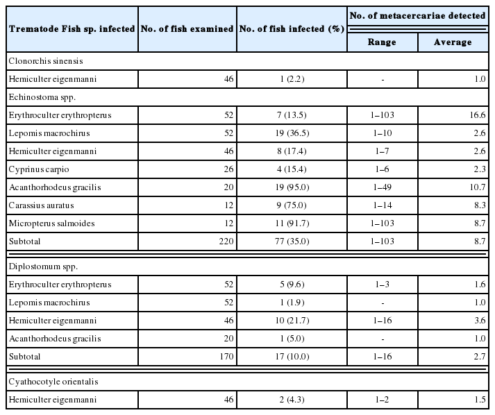 Table 2 Infection status of trematode metacercariae by fish species caught Woopo-neup (swamp) in Changnyung-gun, Gyeongsangnam-do, Korea