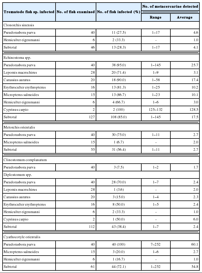 Table 1 Infection status of trematode metacercariae by fish species caught from Junam-jeosuji (reservoir) in Changwon-si, Gyeongsangnam-do, Korea
