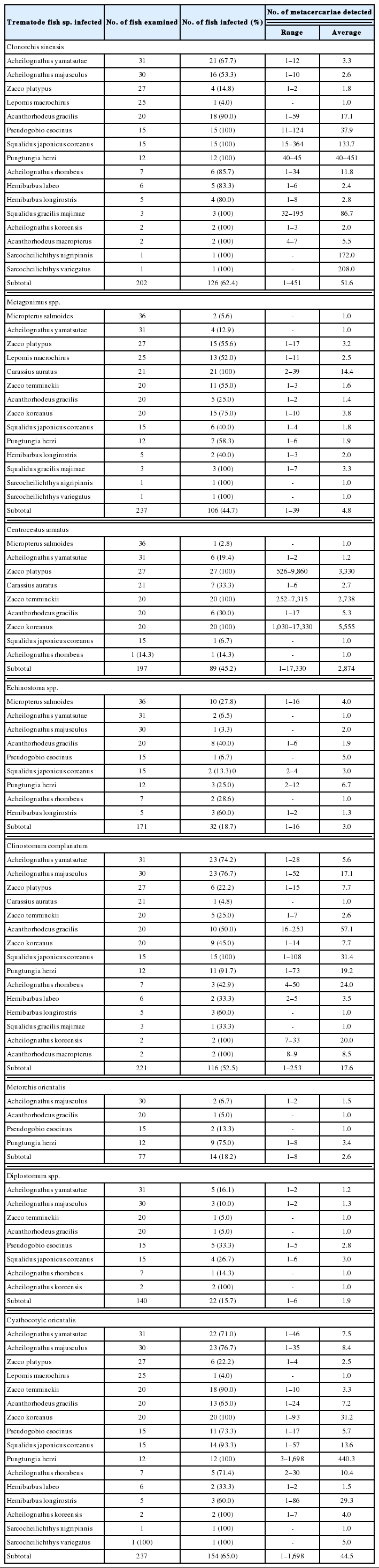 In fishes from Yangcheon (control site), more than 8 species, i.e., C. sinensis, Metagonimus spp., C. armatus, C. complanatum, C. orientalis, M. orientalis, Echinostoma spp., and Diplostomum spp., of DTM were detected, and their infection status by the fish species is detailedly revealed in Table 3.